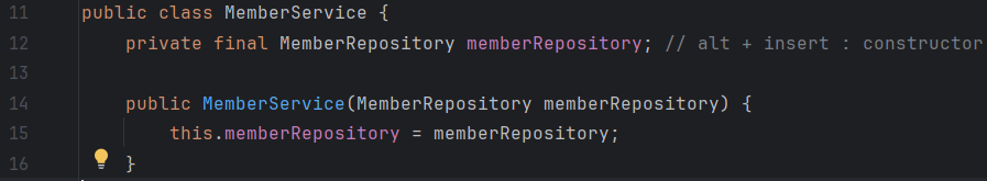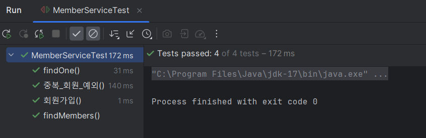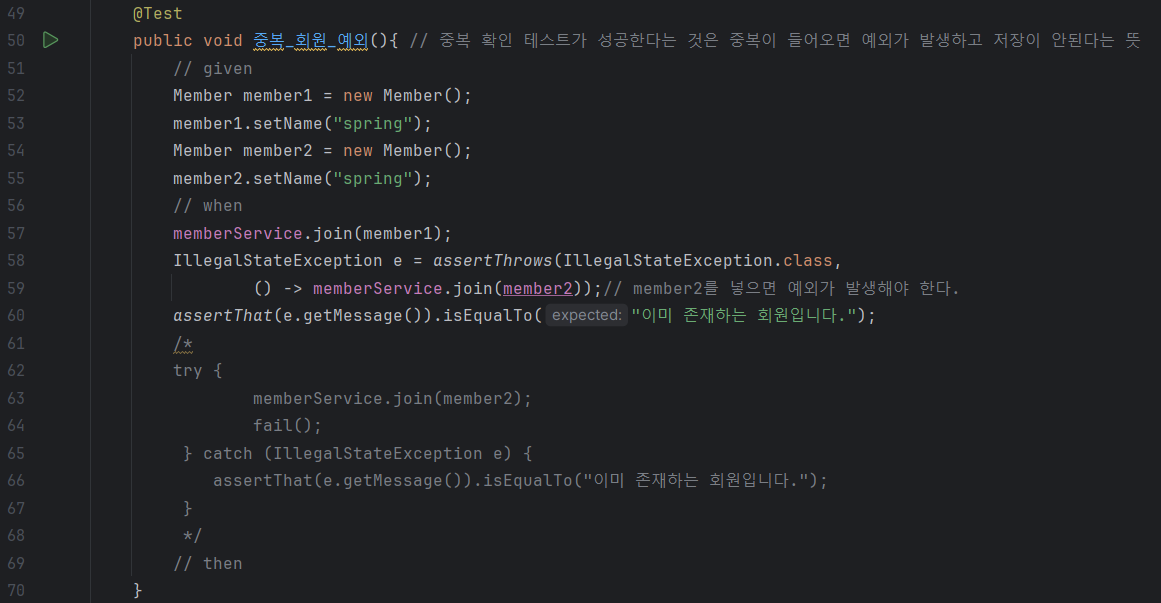 회원 서비스를 테스트할때는 MemberService와 MemoryMemberRepository 둘 다 이용한다. 그러나 각각 객체를 만들면(주석처리한 부분) 다른 메모리를 사용해서 테스트가 제대로 이뤄지지 않는다.(물론 우리는 static을 사용해서 문제없긴 함..) 그래서 아래에 BeforeEach를 추가 했다. 테스트를 하기 전에 인스턴스를 초기화하고, 그 인스턴스를 이용해 또 인스턴스를 초기화한다. memberService에 이를 위한 코드를 추가해주었다.