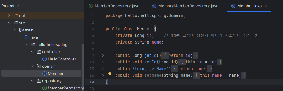 회원은 id와 이름으로 구성된다. 그리고 외부에서 접근 가능한 메소드 여러개 만들었다.
