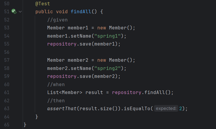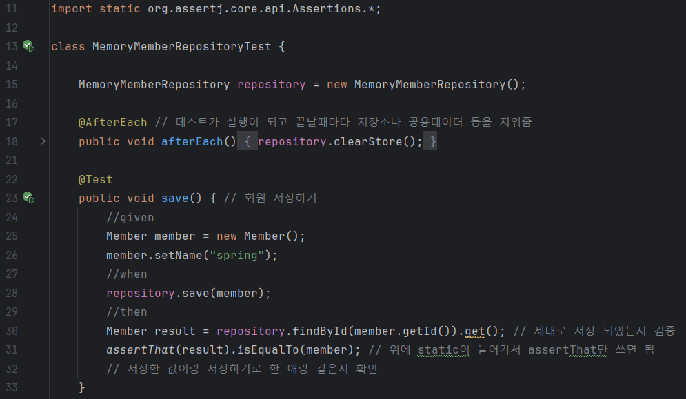 테스트 한 과정이 끝났을때 저장소와 공용데이터의 삭제가 필요하다. 이게 없으면 이전에 사용한 값이 남아서 테스트가 제대로 되지 않을 수 있다. 그리고 회원이 제대로 저장되었는지 확인하는 테스트 코드를 작성했다. 원래는 assertions.assertThat ... 이런식으로 작성해야되는데 static이라서 위에 자동으로 생긴다나 머라나.. 이해는 안되지만 그런게 있구나 했다. 아무튼 우리는 편리하게 asserThat만 사용해도 된다.