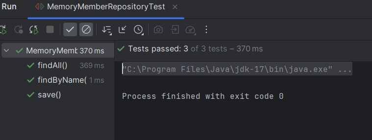 1에서 만든 findById, findAll, findByName을 테스트 해볼 것이다. 실무에서는 테스트 주도 개발이 더 많이 쓰인다고 한다. 테스트를 먼저 만들고, 구현한 다음 테스트를 해보는 것이다. 우리는 배우는 과정이라서 그렇게 하지 않았다.