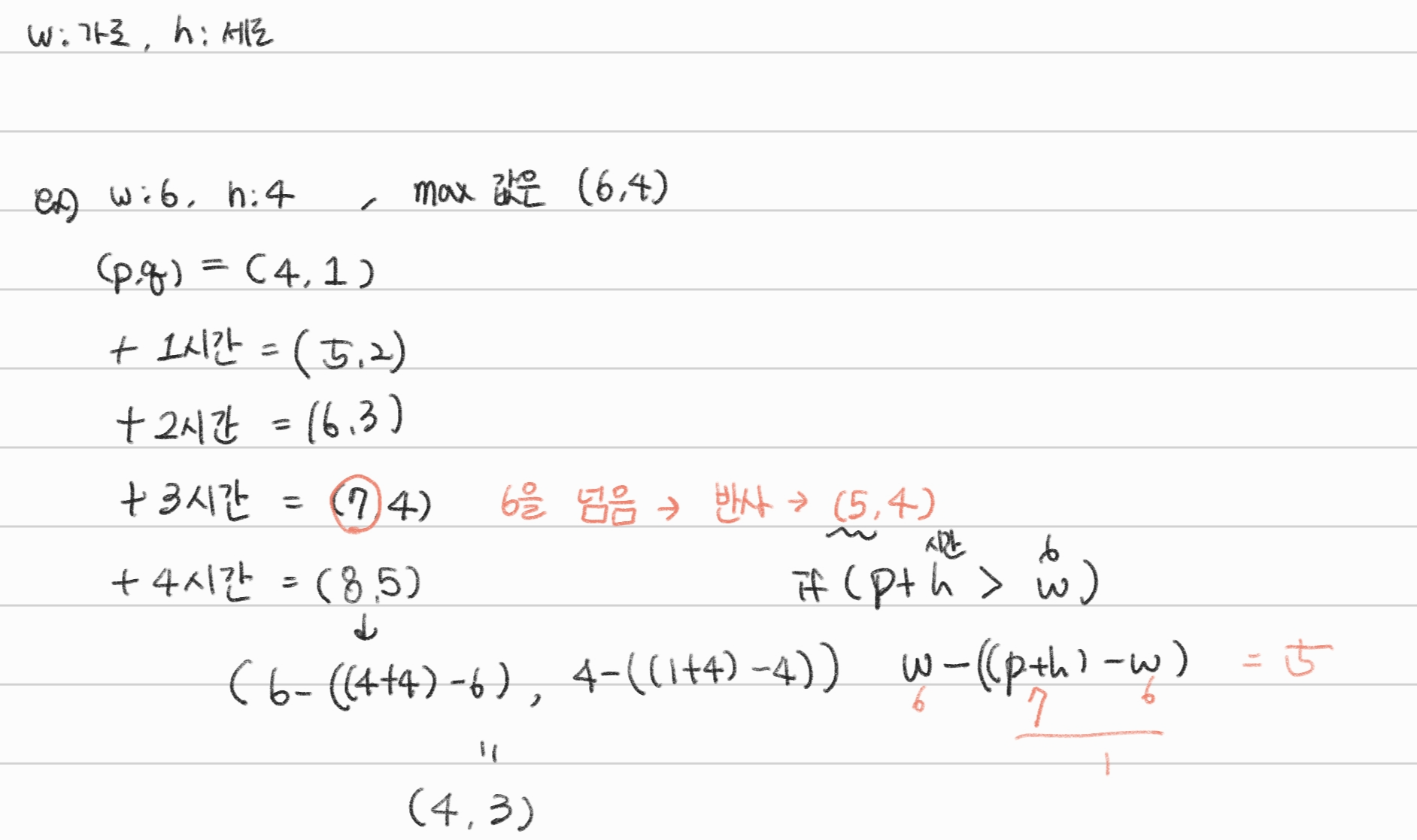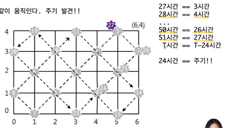 우측에 있는 글처럼 27시간 뒤의 개미의 위치와 3시간 뒤의 개미의 위치는 같다. 이를 간단하게 식으로 표기하면 '도착점 = (시작점 + 시간) % x축(혹은 y축)*2' 가 된다. 그렇게 구한 값은 '도착 위치'가 아니라 '27시간 뒤 위치는 3시간 뒤 위치랑 같아!!' 이므로 3시간 뒤의 위치를 따로 구해주어야 한다. 방법은 여러가지가 있지만 내가 처음에 생각한 거울에 반사하는(?) 알고리즘을 적용했다.