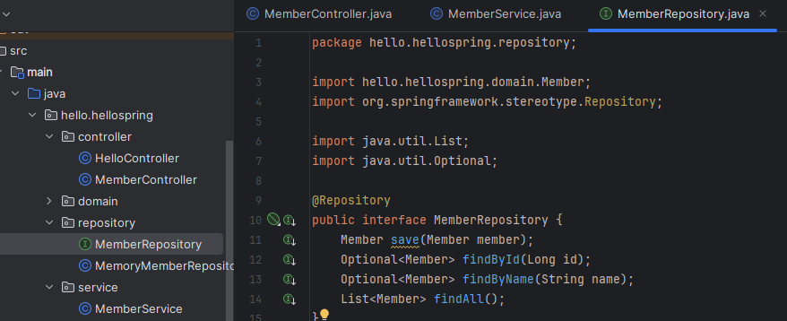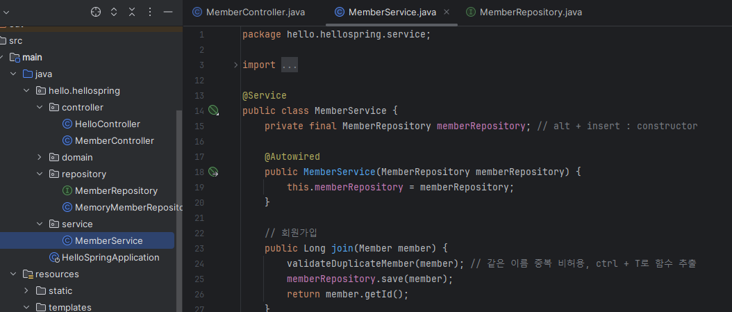 new MemberService를 생성할때(12번째줄) 생성자에 MemoryMemberRepository가 필요하므로 MemberRepository도 만들어준다.(13번째줄)
