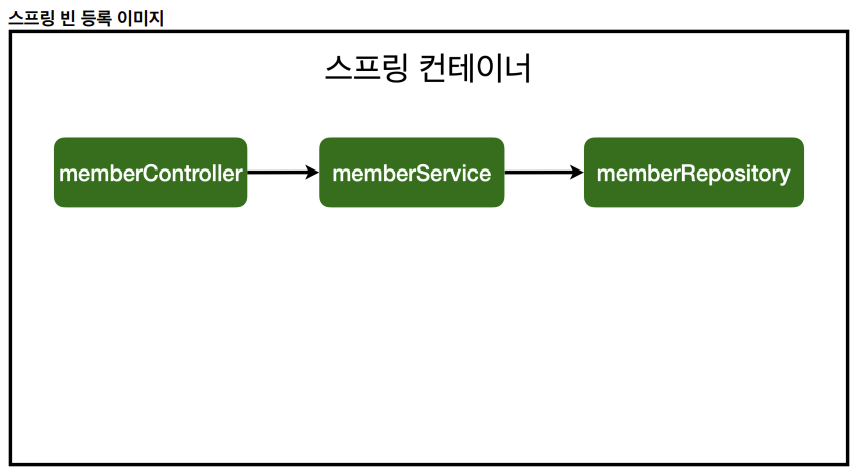 1과 2의 방식으로 스프링 빈에 등록하면 스프링 컨테이너에 이런 식으로 memberController와 MemberService, memberRepository가 연결되어 등록된다.