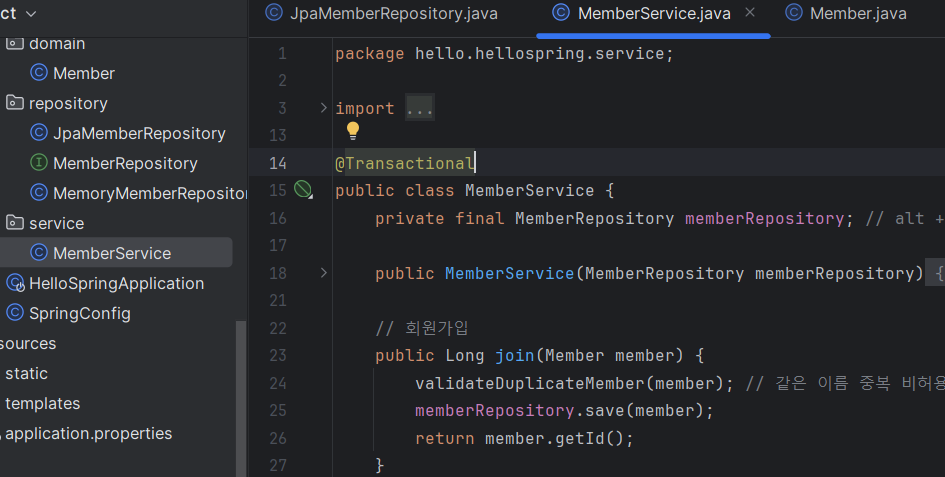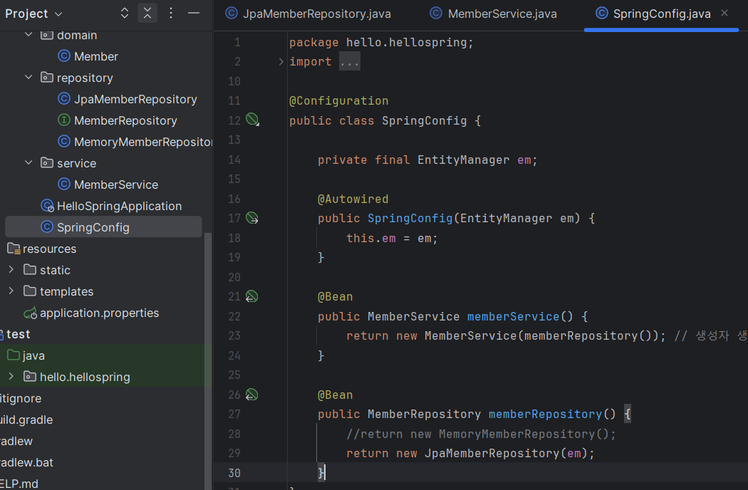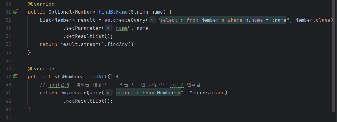 JpaMemberRepository 를 생성하고 MemberRepository를 implements 했다.. JPA는 EntityManager(이하 EM)를 필요로해서 만들어주고 맞춰서 코드를 짜줬다. save와 findById는 EM이 제공하는 메소드인 persist와 find가 있어서 쉽게 작성했다. 그 외의 메소드는 jpql언어를 이용해서 작성했다. 나중에 스프링 JPA를 사용하면 jpql없이 더 편리하게 짤 수 있다고 한다.