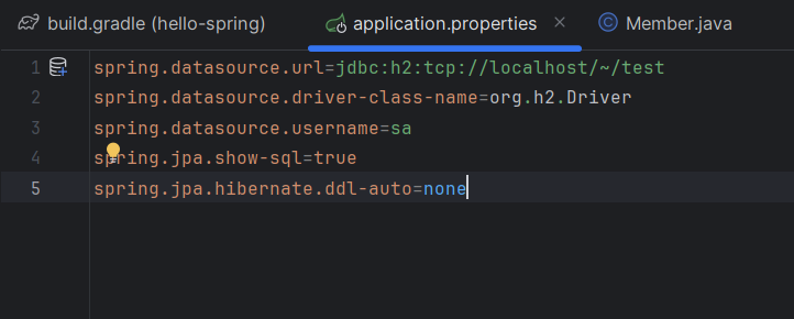 ddl-auto : JPA는 테이블을 자동으로 생성하는 기능을 제공하는데, none를 사용하면 해당 기능을 끈다.
