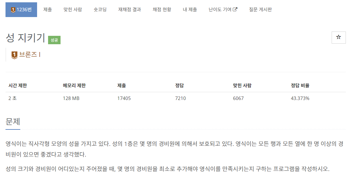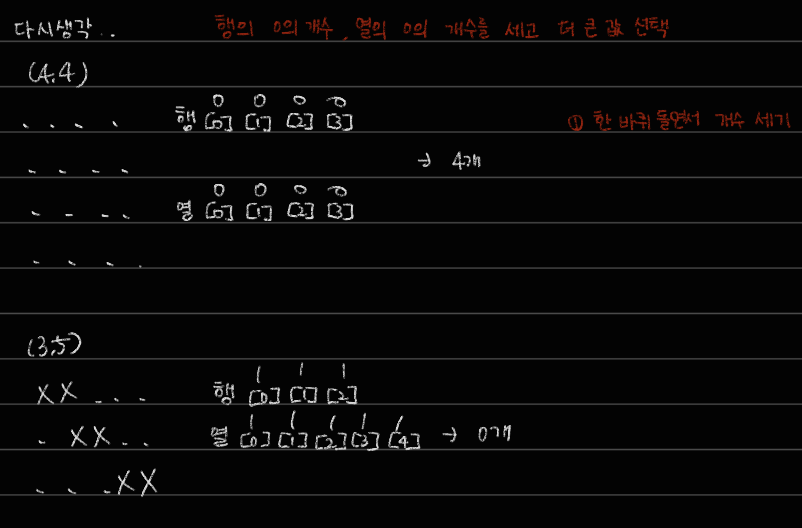 문제 자체는 어렵지 않다! 1. 가로세로에 병사가 배치되어있는지 확인하고 2. 병사가 하나도 배치되지 않은 행(또는 열)의 수를 세어서 3. 가로 세로 중 더 큰 값을 출력하면 된다.