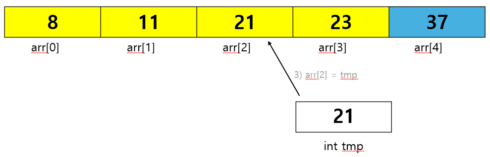 0) 알맞은 자리를 찾는다. 1) tmp에 arr[3]을 저장한다. 2) 알맞게 자리를 이동한다. 3) 알맞은 자리에 tmp를 넣는다.