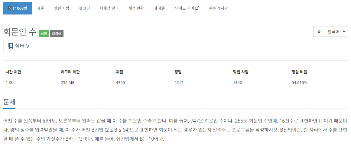 진법변환&Palindrome이 섞인 문제. 각각은 구현해봤지만 섞어서는 처음이다. 앞에 11005번처럼 B진법 문자를 하나하나 다 대응하지 않았다. 출력하지 않으니 굳이 문자를 대응할 필요가 없기 때문이다.